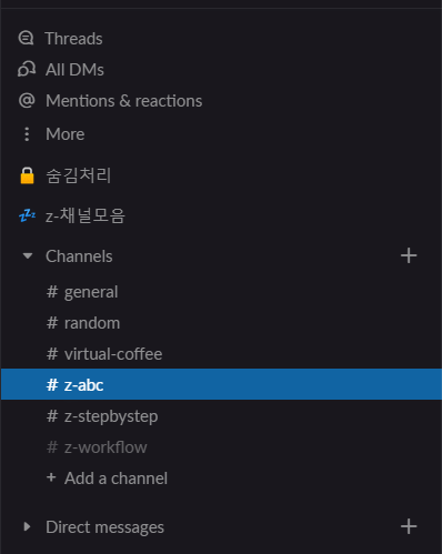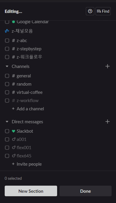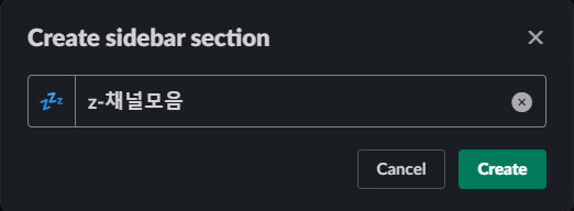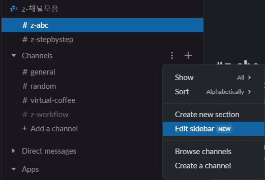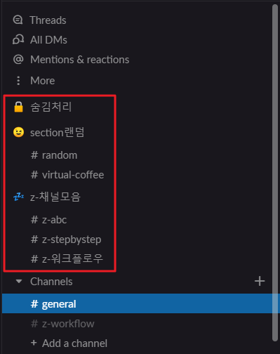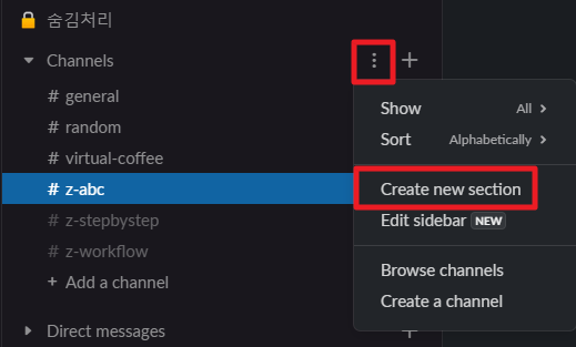 1. section 생성 : Channels 옆 3점 메뉴 > Create new section