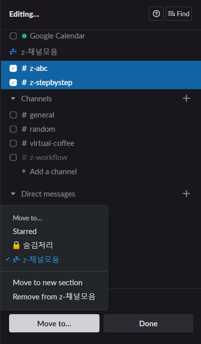 4. 대량의 채널 이동이 필요하다면, Edit sidebar > 채널 체크 > Move to > 이사갈 section 선택 > Done