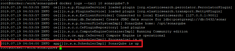 $ docker logs --tail 10 sonarqube7.9 # 로그의 마지막 10줄만 출력