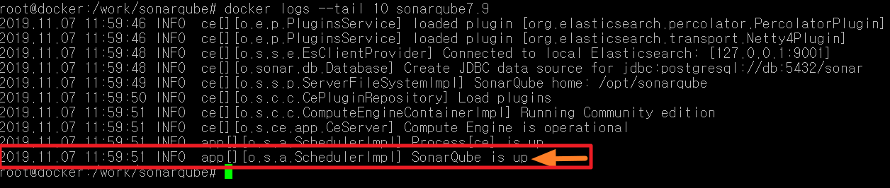 docker logs --tail 10 sonarqube7.9 # 로그의 마지막 10줄만 출력