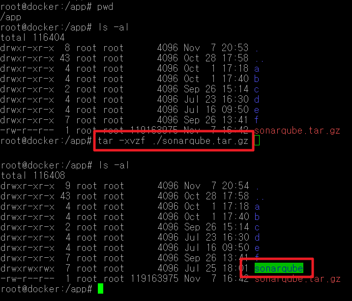 $ ls -al # /app/sonarqube 디렉토리 생성 확인